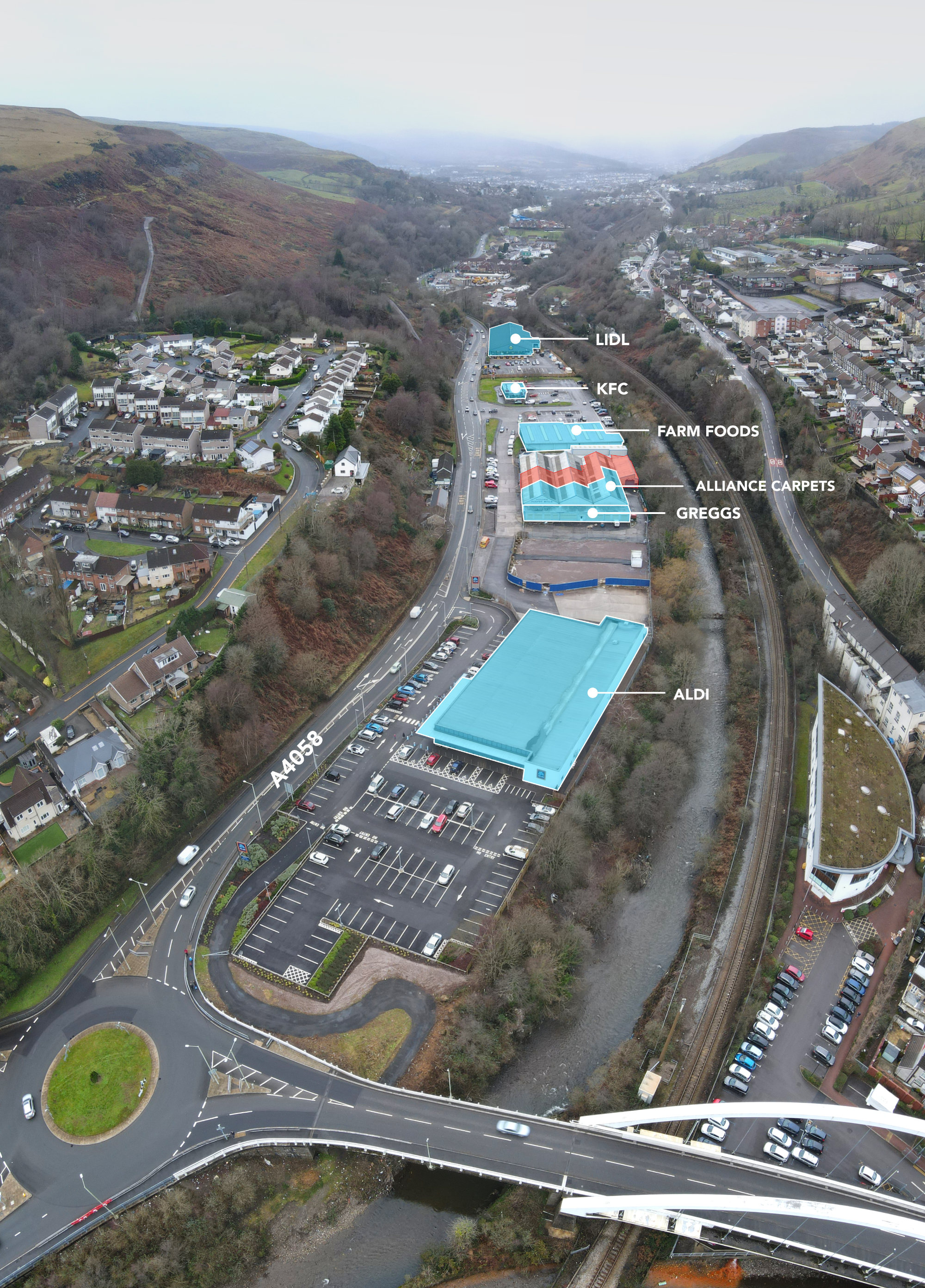 Retail unit in prominent roadside location fronting the A4058 adjacent to Greggs, Aldi, Lidl, KFC and Farm Foods and comprising 5,781 sq ft retail space plus 1,864 sq ft storage and ancillary 235 sq ft available TO LET